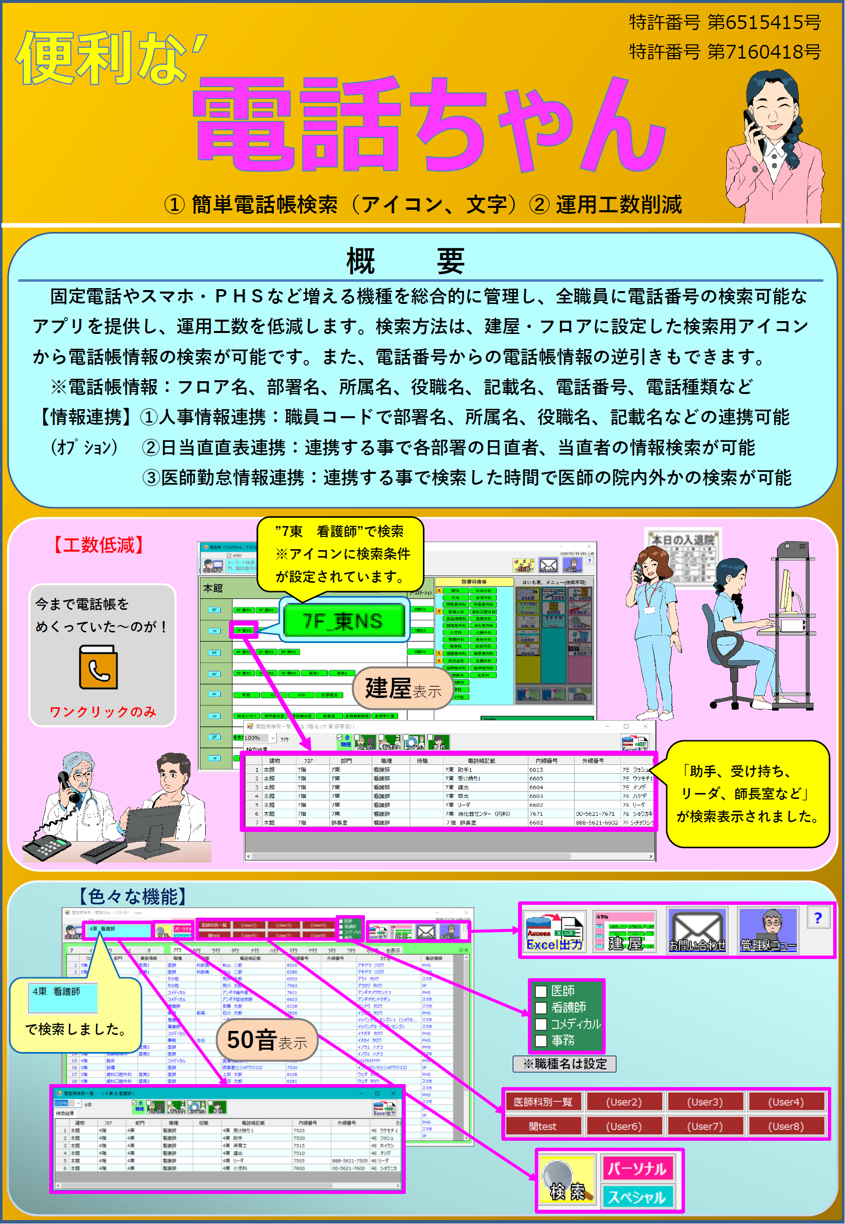 ②日当直直表連携:連携する事で各部署の日直者、当直者の情報検索が可能。(オプション)