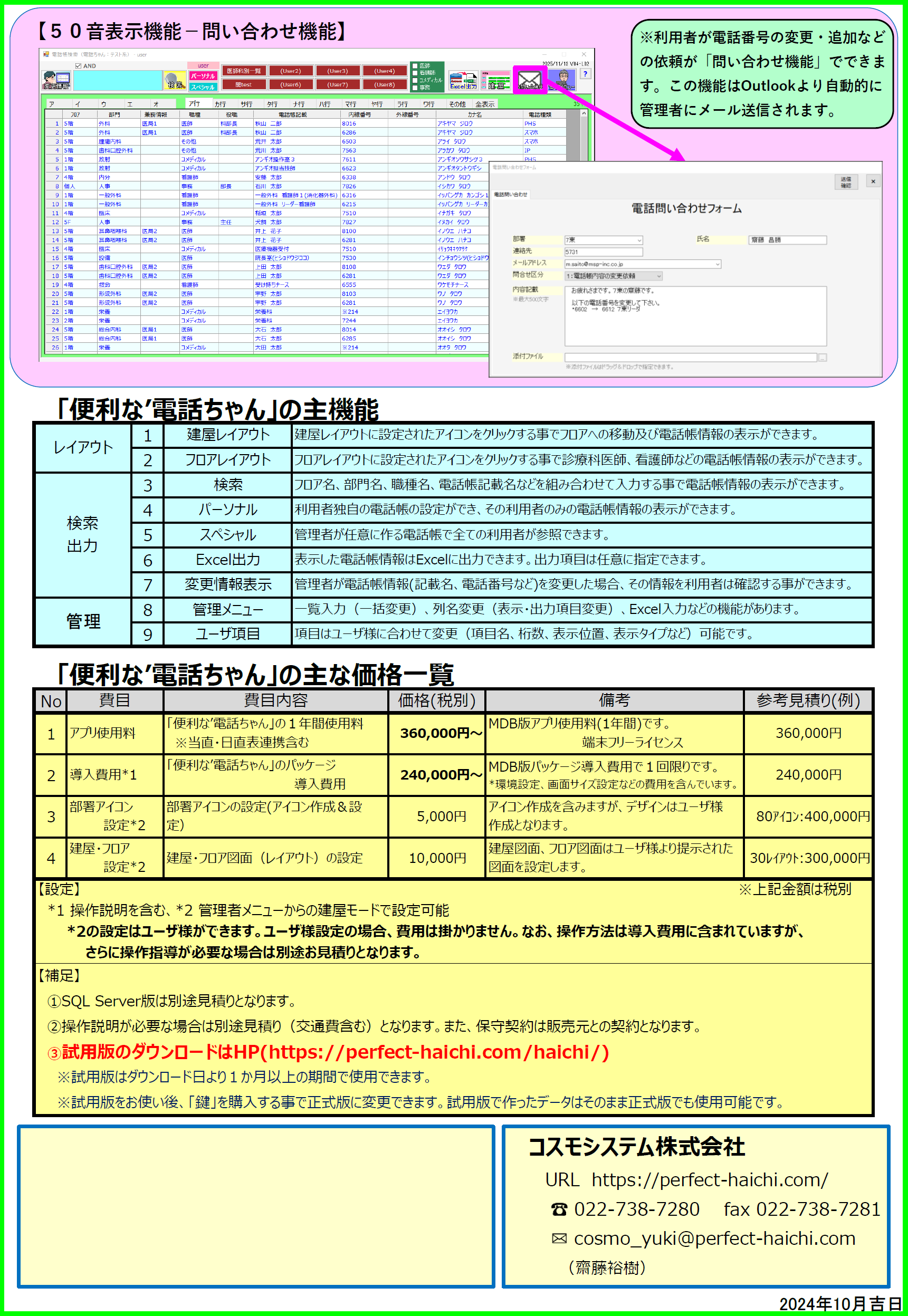 ※電話帳情報:フロア名、部署名、所属名、役職名、記載名、電話番号、電話種類など。